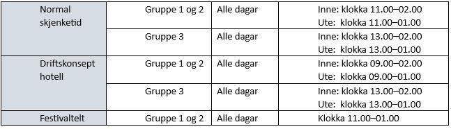 Det er i skjenkeløyvet ditt bestemt kva skjenketid som gjeld. I alkoholpolitisk handlingsplan går det fram at skjenketidene skal vere innanfor desse tidene: